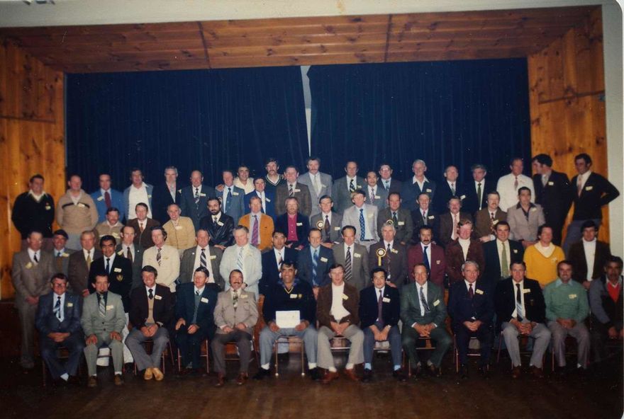 Players of the 1950 decade at the Foxton Rugby Club 1980 Reunion. Poodle MacDonald holds card in centre.