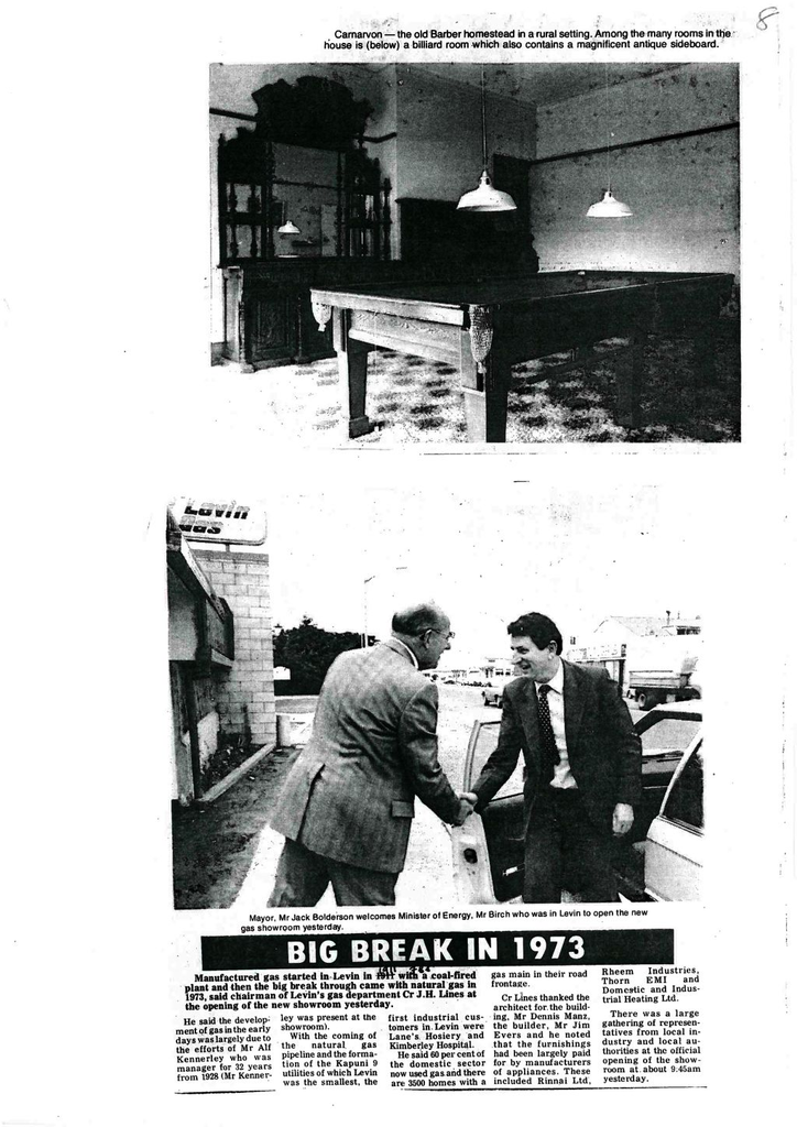 Manufactured gas began in Levin in 1911 with a coal-fired plant and then the big break came with natural gas in 1973, said chairman of Levin’s gas department Cr J.H. Lines at the opening of the new showroom yesterday.He said the development of gas in the early days was largely due to the efforts of Mr Alf Kennerley who was manager for 32 years from 1928 (Mr Kennerley was present at the showroom).