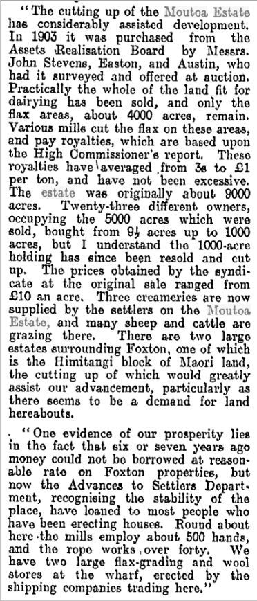 "The cutting up of the Moutoa Estate has considerably assisted development. In 1903 it was purchased from the Assets Realization Board by Messrs. John Stevens, Easton, and Austin, who had it surveyed and offered at auction. Practically the whole of the land fit for dairying has been sold, and only the flax areas, about 4000 acres, remain. Various mills cut the flax on these areas, and pay royalties, which are based upon the High Commissioner's report. These royalties have averaged from 3se to £1 per ton, and have not been excessive.