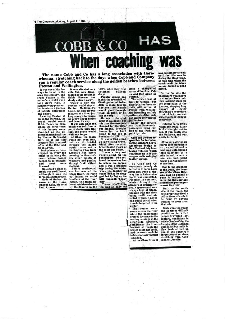 Cobb & Co were responsible for introducing the standard, heavy American design to New Zealand, big lumbering vehicles which could take up to 24 passengers on its swinging leather springs.By Cobb & Co coach was the only alternative to horse back until 1886 when a railway line to Palmerston North was completed. Pleasant in summer, winter brought the dangers of swollen rivers. A spare coach was always kept at Otaki, because with the river being swift and affected by tide, it never had a dead period when it could be forded in the winter.