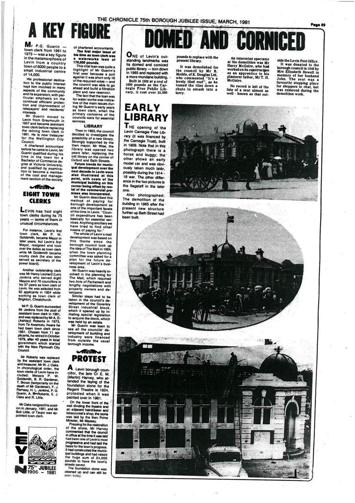 Mr P.G. Guerin-town clerk from 1961 to 1973-was a key figure in the metamorphosis of Levin from a country town of 6000 people to a small industrial centre of 14,000.