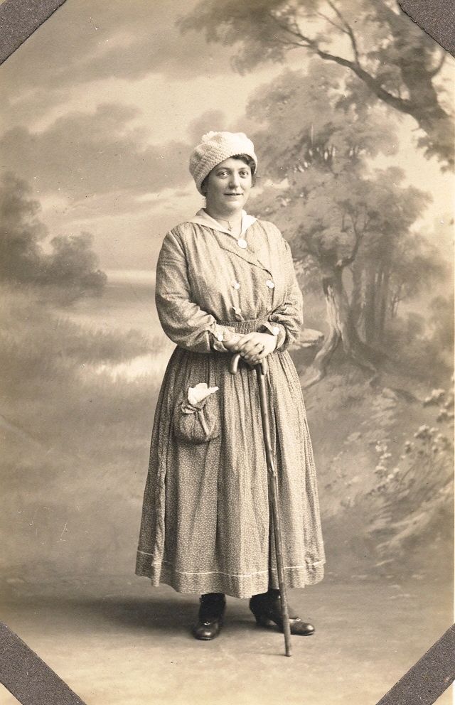 Photo of a young lady standing in front of a backdrop of a rural scene. Could she be a charactor in a play perhaps?