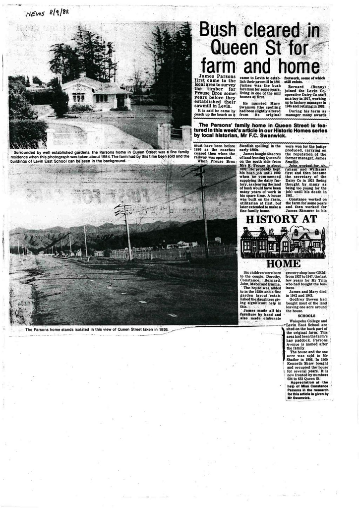 Waiopehu College and Levin East School are sited on the back part of the original farm. This area had been the farm’s hay paddock. Parsons Avenue is named after the family.The house and the one acre was sold to Mr. Shailor in 1956. In 1960 Kenneth Shaw bought and occupied the house for several years. It is now fronted by numbers 624 to 632 Queen St.