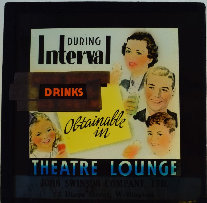 In the golden age of Kiwi cinemas many theatres had a well stocked intermissions full of food, drinks and ice creams. The Kerridge-Odeon cinema chain called their's 'Nibble Nooks'- but this slide looks like it came from an independant cinema. It would have screened during the interval itself as a reminder for hungry film-watchers.