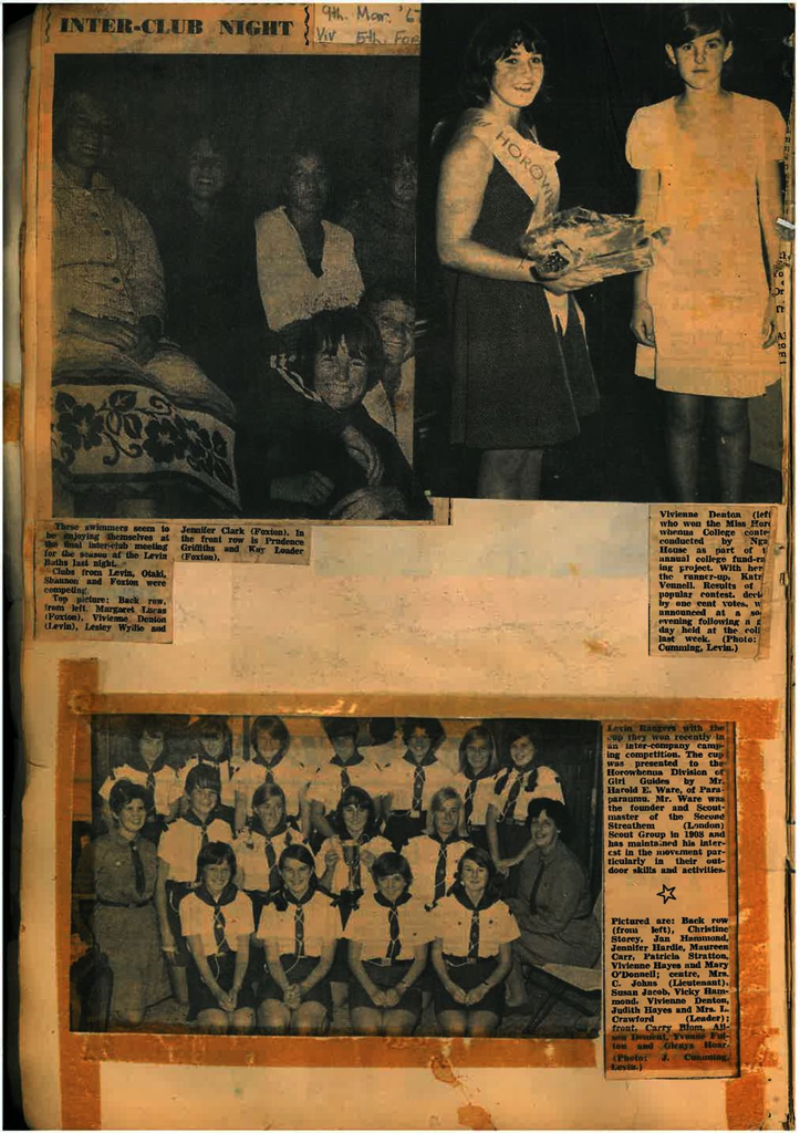 Bottom Photo - Levin Rangers. Photo - Back row from left - Christine Storey, Jan Hammond, Jennifer Hardie, Maureen Carr, Patricia Stratton, Vivienne Hayes & Mary O'Donnell. Centre row - Mrs C Johns, Susan Jacob, Vicky Hammond, Vivienne Denton, Judith Hayes & Mrs L Crawford. From row Carry Blom, Alison Dement, Yvonne Fulton & Glenys Hoar.