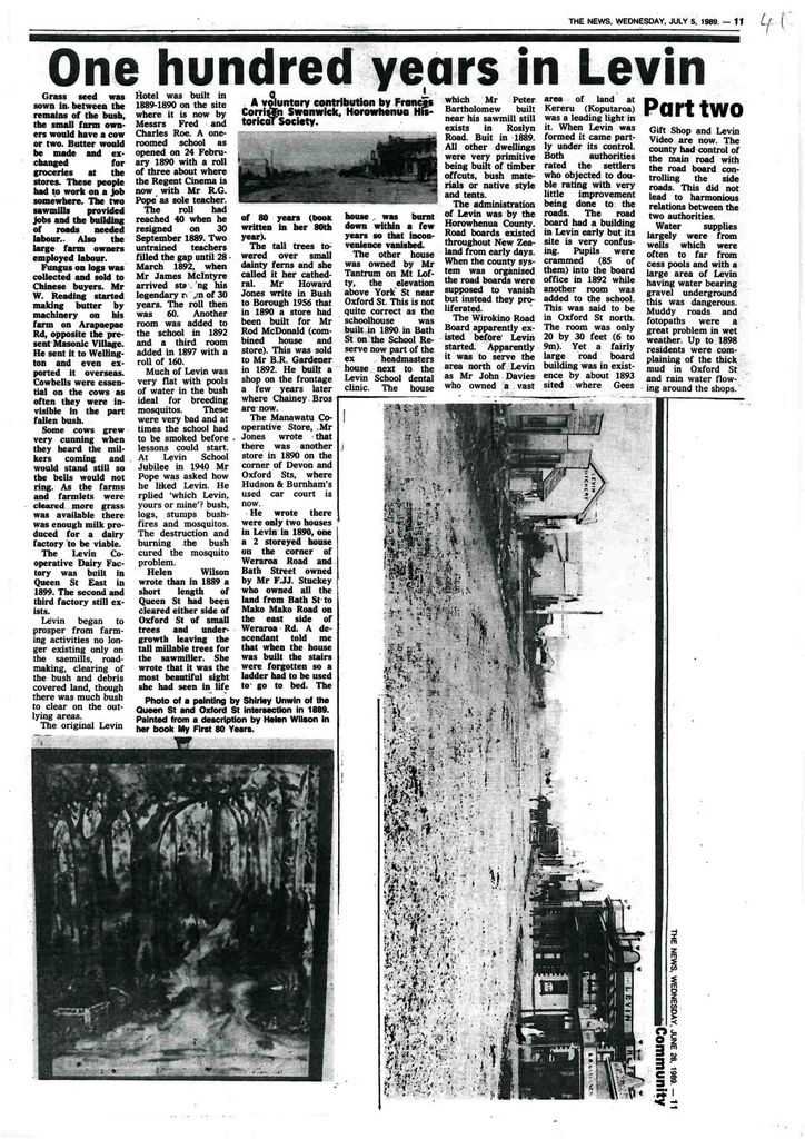 The other house was owned by Mr Tantrum on Mt Lofty, the elevation above York St near Oxford St. This is not quite correct as the schoolhouse was built in 1890 in Bath St on the School Reserve now part of the ex headmasters house next to the Levin School dental clinic. The house which Mr Peter Bartholomew built near his sawmill still exists in Roslyn Road, built in 1889. All other dwellings were very primitive being built of timber offcuts, bush materials, or native style and tents.