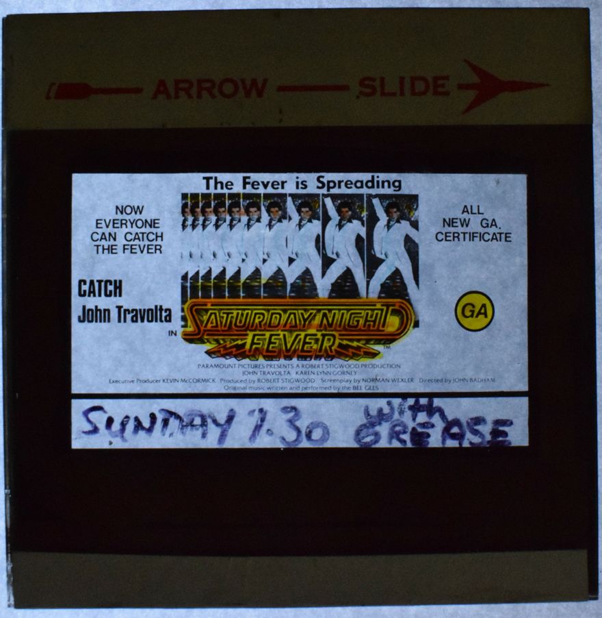 It was a busy time for John Travolta- this slide reveals that 'Saturday Night Fever' was being shown as a double billing with 'Grease'- another Travolta film!