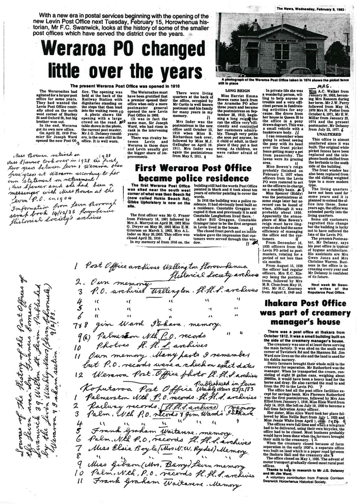 Miss Bowen’s reign probably finished on February 2, 1927 when officers from the Levin PO were rostered to act as the officers-in-charge on a monthly basis.