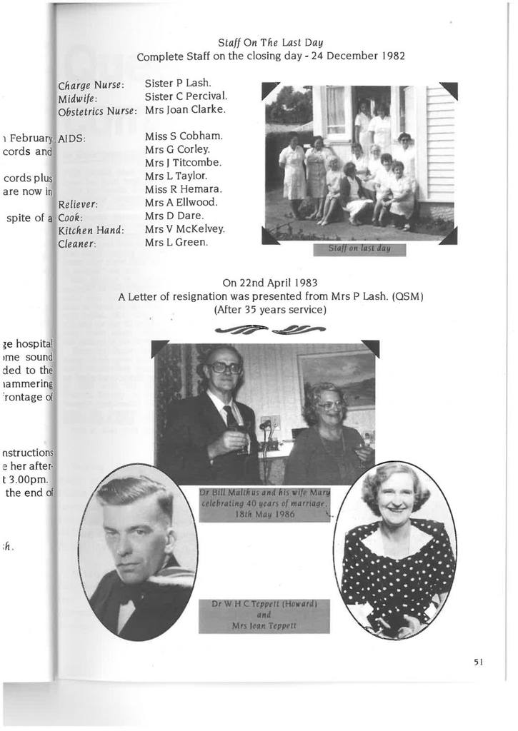 Charge Nurse: Sister P Lash. Midwife: Sister C Percival. Obstetrics Nurse: Mrs Joan Clarke. AIDS: Miss S Cobham. Mrs G Corley. Mrs J Titcombe. Mrs L Taylor. Miss R Hemara. Reliever: Mrs A Ellwood. Cook: Mrs D Dare. Kitchen Hand: Mrs V McKelvey. Cleaner: Mrs L Green. On 22nd April 1983