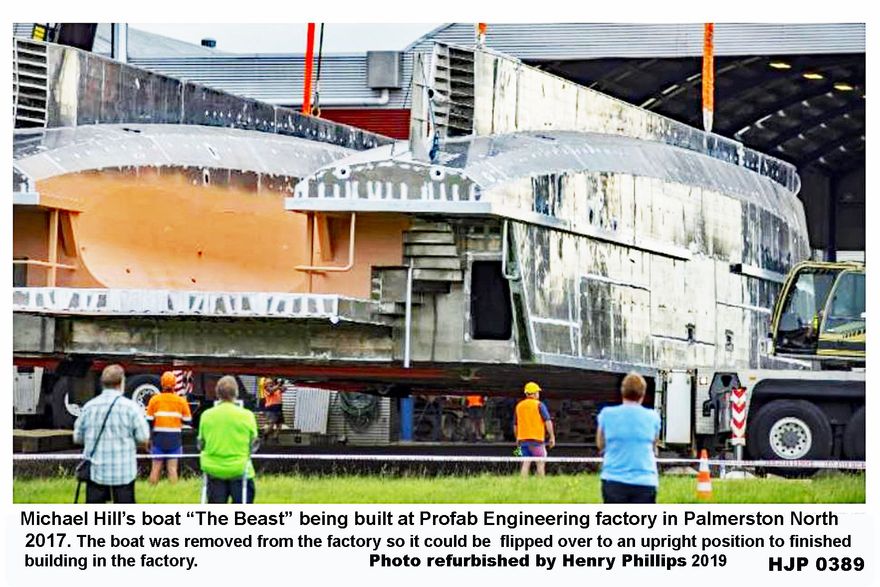 HJP 0389 The Beast under construction at Profab Engineering Palmerston North 2018 Boat ready to be flipped over to finish building.