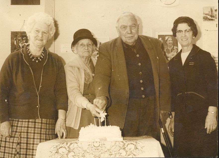 Penciled on back - The Oldest members of the Shannon Old Folk’s Club Mrs M. Tippler and Mr H.C. Anderson, cutting the 10th anniversary cake at the recent function. With them are past president Mrs H.M. Fitzgerald and president Mrs L. Hook. Mon. Aug. 25, 1969.