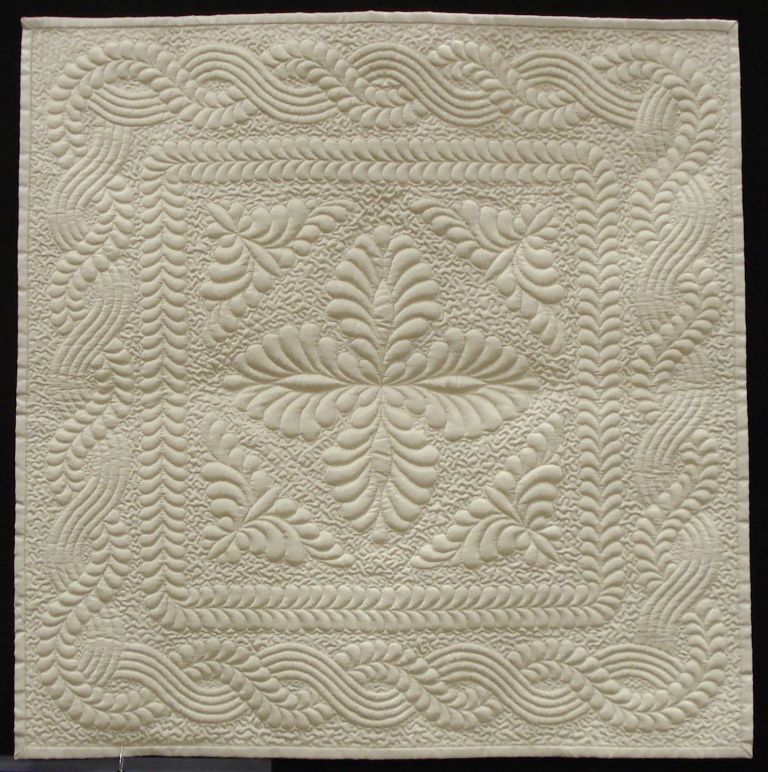 This quilt was designed to fit a small piece of polyester silk that I had. The quilted feather patterns are traditional.