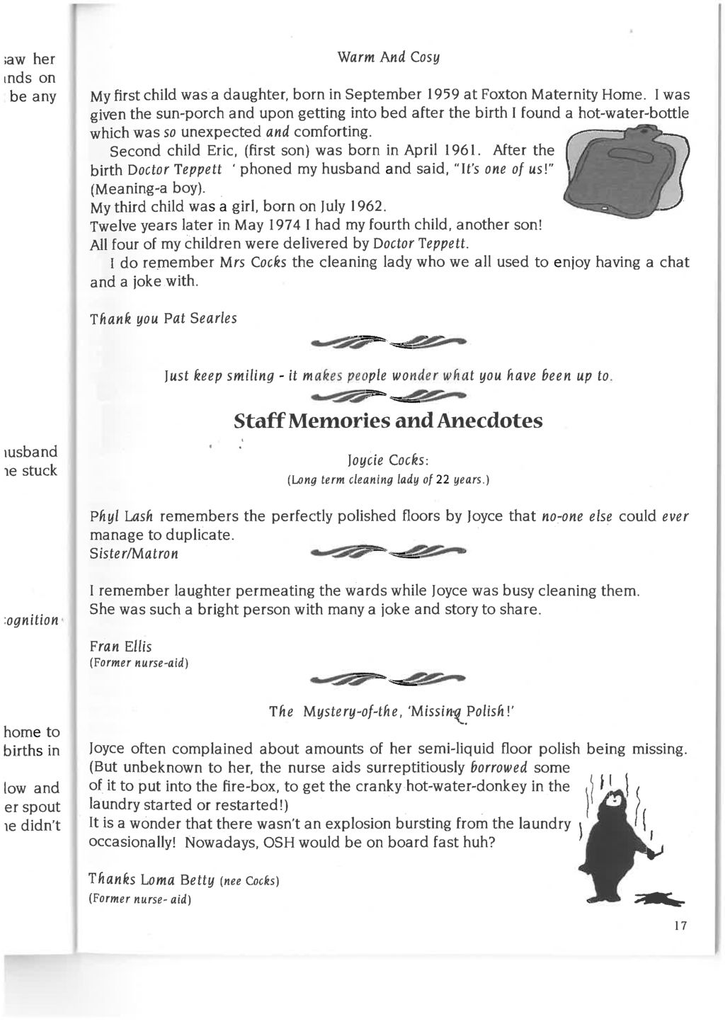 My first child was a daughter, born in September 1959 at Foxton Maternity Home. I was given the sun-porch and upon getting into bed after the birth 1 found a hot-water-bottle which was so unexpected and comforting.Second child Eric, (first son) was born in April 1961. After the birth Doctor Teppett 'phoned my husband and said, "It's one of us!" (Meaning-a boy).