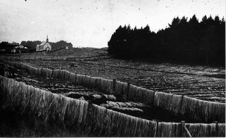 St Mary’s and Holy Angels Church, c.1900. In the foreground are flax tow paddocks along Cook Street. The fibre was later processed at King’s mill.