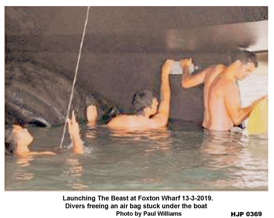 HJP 0369 Divers freeing up an air bag stuck under the boat The Beast at Foxton Beach launching ramp 2019