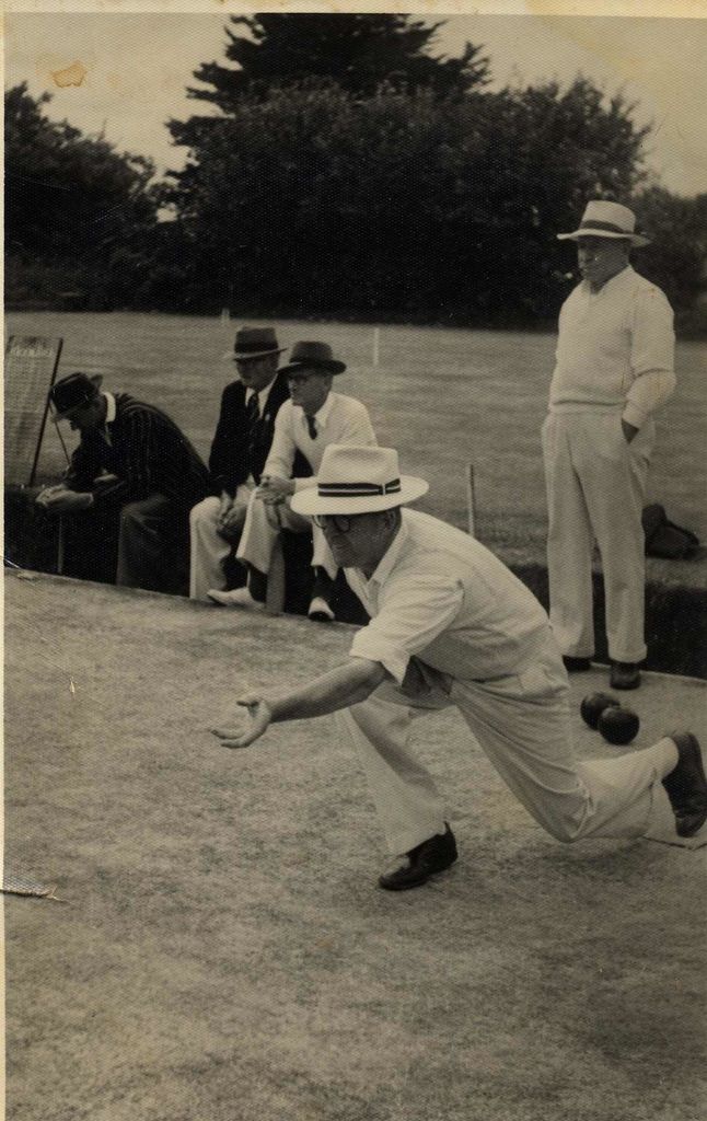 Harry Hughes stands with his hands in his pockets watching Herb Wenham bowl at the Levin Bowling Club c1930-1940.