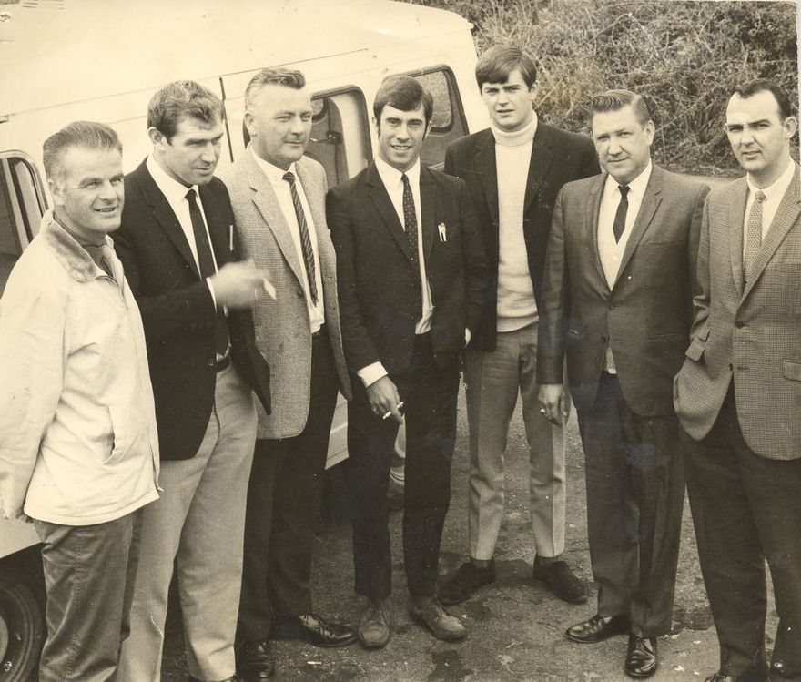 Penciled on back - Survey team for survey of gas appliances in preparation for the conversion to natural gas. from left, Messrs : R. Watt, T. Victory, L. Watt, M. Willstone, T.J. Ross, J. Nelson, and R. Kemp. 11 April 1969.