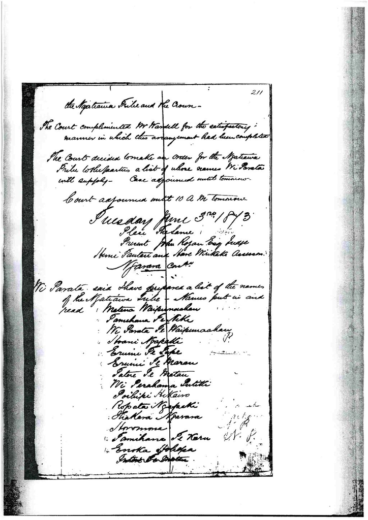 Ordered that a certificate of the title of Wi Parata Waipunaahau, Wi Tamihana Te Neke, Hemi Matenga Waipunaahau, Hoani Ngapaki, Tutere Matau, Tamihana Te Karu, Rihi Kapoata, Ihakara Te Ngarara be made and issued to the parties when they have furnished a proper survey thereof and that the names of all the persons interested and given in by Wi Parata and read, be registered in the court under Sec 17 Act 1867 and that whenever the said land is granted by the crown the legal estate therein shall be made to rest in the parties on the 3rd day of June 1873.