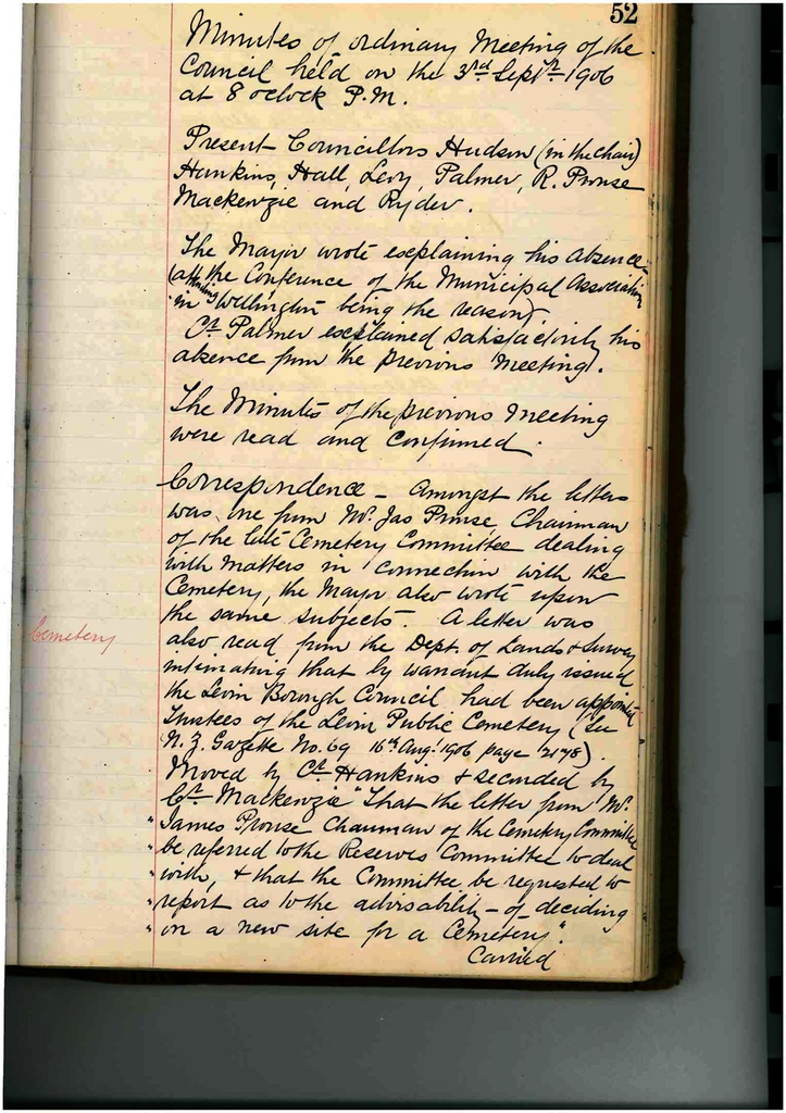 Correspondence – Amongst the letters was one from Mr Jas Prouse Chairman of the late Cemetery Committee dealing with matters in connection with the Cemetery. The Mayor also wrote upon the same subjects. A letter was also read from the Department of Lands and Survey intimating that by warrant duly issued the Levin Borough Council had been appointedTrustees of the Levin Public Cemetery (See N.Z. Gazette No. 69 16th August 1906 page 2178).