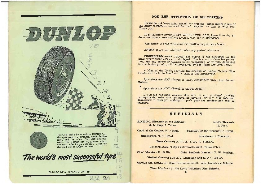 Contains Advertisement for Dunlop Tyres, details for Spectators and List of Officials.