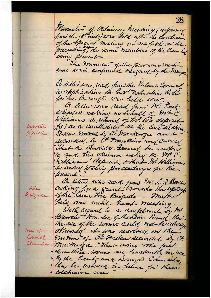 A letter was read from Mr. Park Solicitor asking on behalf of Mr. C Williams a refund of Mr Williams deposit (£3) as a candidate – at the late election. It was moved by Cr. Mackenzie and seconded by Cr. Hankins, and carried "that the Auditor General be written to and his opinion asked re Mr C Williams deposit and that Mr Williams be asked to stay proceedings for the present."