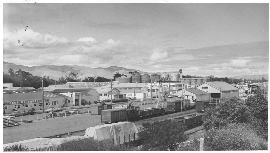 View (from a high point) across railway to Cambridge Street industrial area. View is to the southeast. Left to Right – Talus Brushware Ltd, Lane’s Fabrics, grain silos, railway goods sheds (foreground), Colyer-Watson Ltd (background).