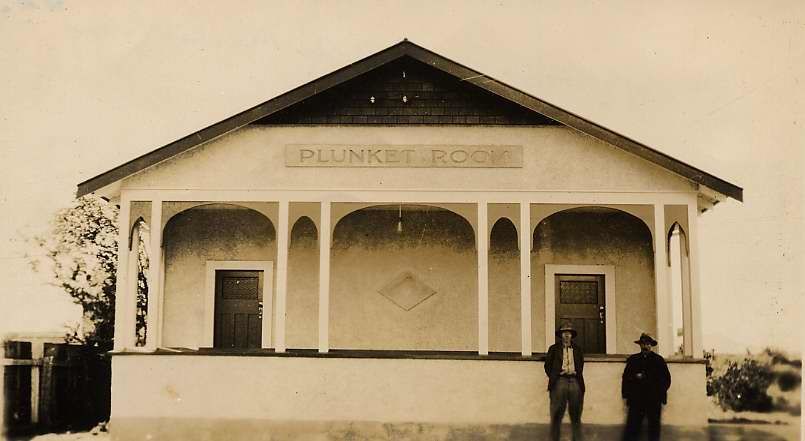 Foxton Plunket Rooms, Clyde Street, Foxton c 1930. Two men stand outside the building one of whom is Mr Thomas who built the building.