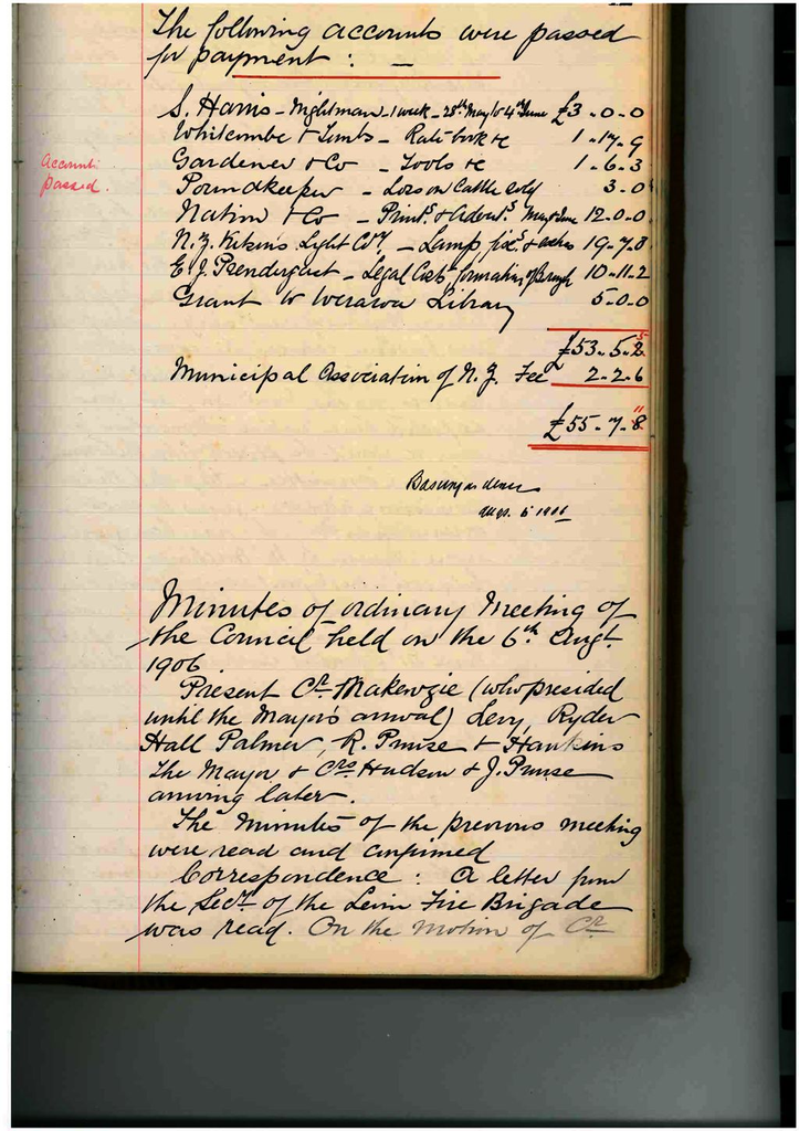 Correspondence: A letter from the Secretary of the Levin Fire Brigade was read. On the motion of Cr Levy, seconded by Cr J Prouse it was carried “That the Levin Fire Brigade be requested to appoint a deputation to wait upon this Council so that the Brigade’s