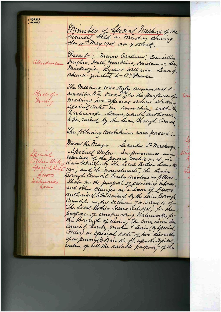 The meeting was duly summoned and constituted and was held for the purpose of making two special orders striking special rates in connection with the waterworks loans recently authorised to be raised by the Levin Borough Council.