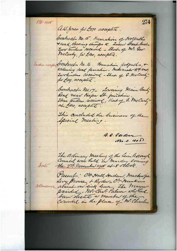 The minutes of the previous meeting and of the Special Meeting held on the 26th October 1908 were respectively confirmed.