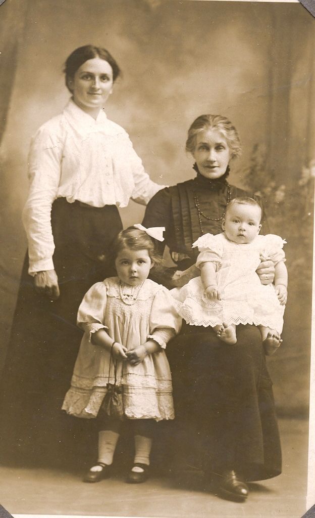 Family photo – Mother sitting with youngest grandchild on her knee. Daughter standing beside her with her eldest daughter standing in front. 1914-1918?