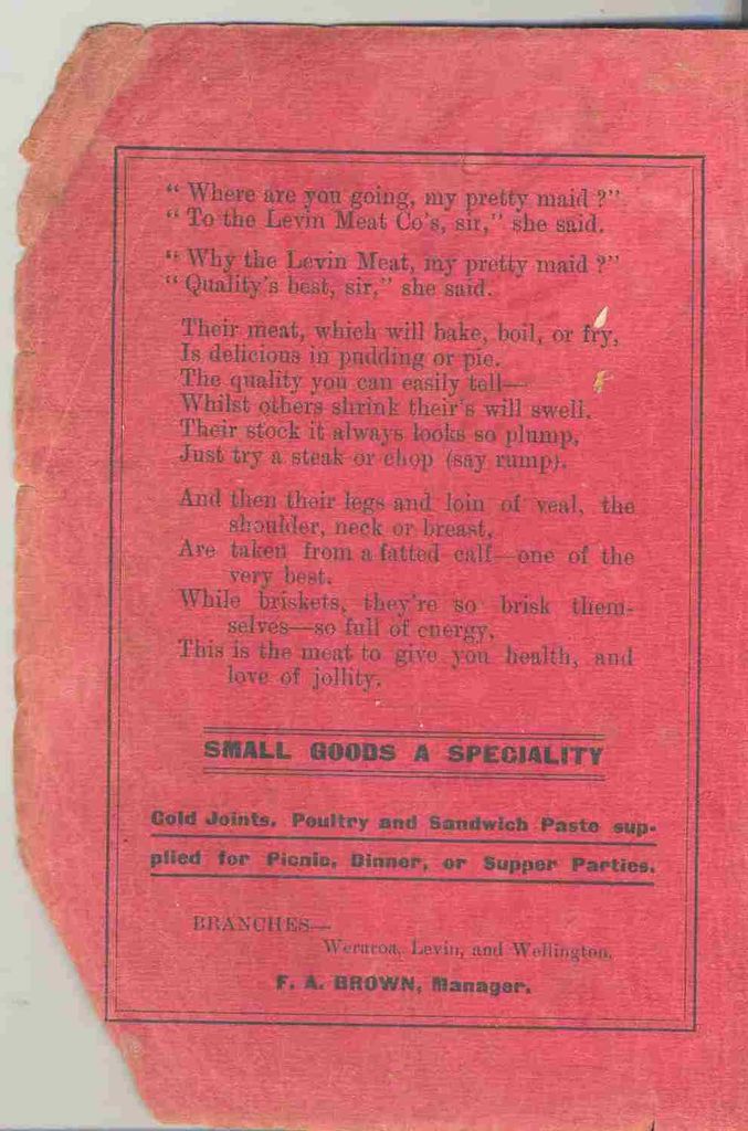 "To the Levin Meat Co's, sir," she said,"Why the Levin Meat, my pretty maid?"
