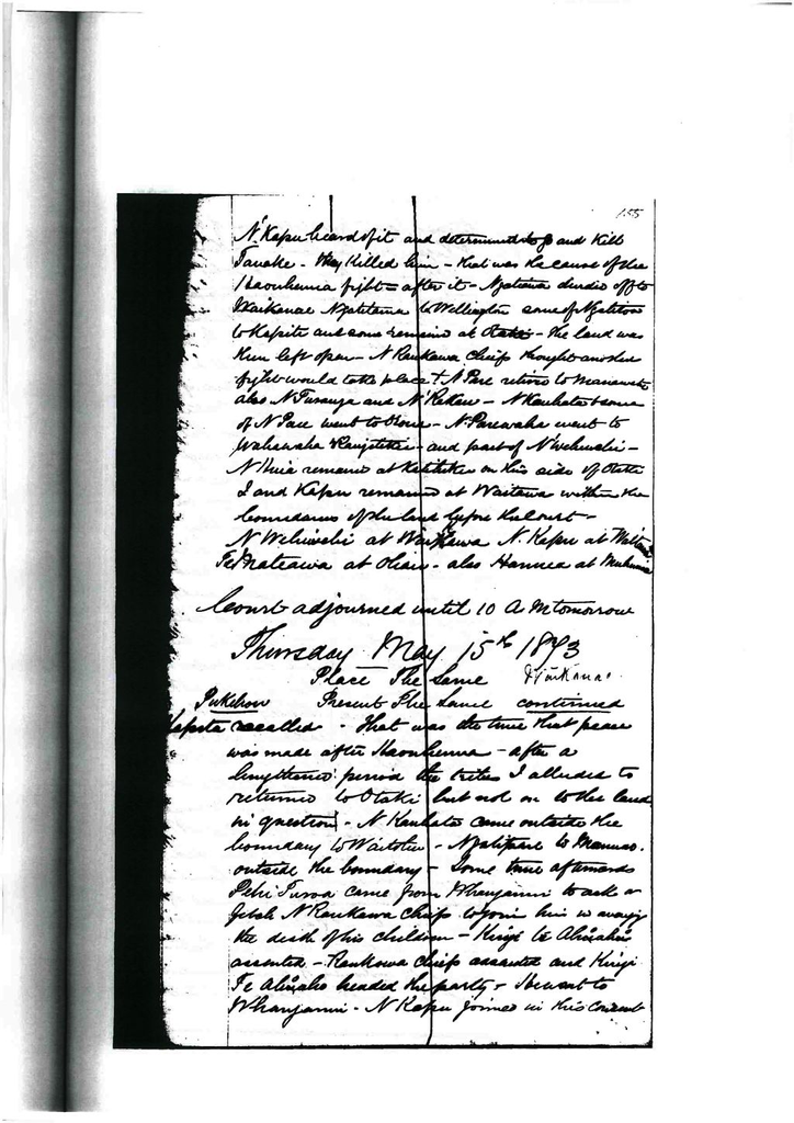 Ngati Kapu returned from Whanganui, part of them lived on the land in question and part at Maringiawai. Ngati Raukawa were killed by Ngati Awa. On their return to Otaki, the several tribes I have alluded then disperse - some to Oroua, some to Manawatu. Ngatikapu remained on this land. Shortly after the fight at Kuititanga, Mr. Hadfield arrived to preach the gospel.