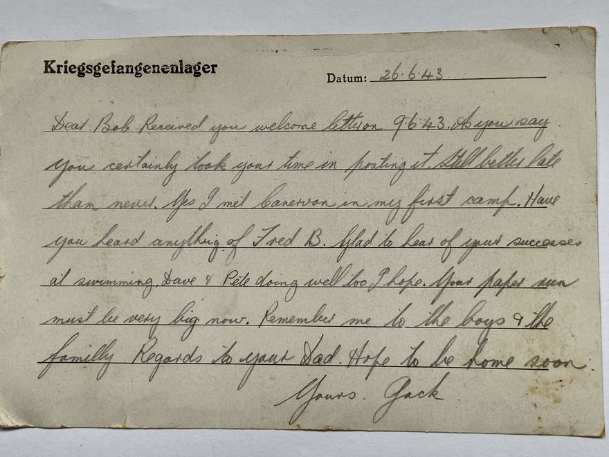 Letter to my father Bob Stannard, from POW Jackhayfield interred in Germany during WWII. Jack worked worked with Bob's father (Bill Stannard) who who owned a bookshop in Levin. Jack reference's Bob's paper round (which included the RAF training camp) and his brothers David and Peter.
