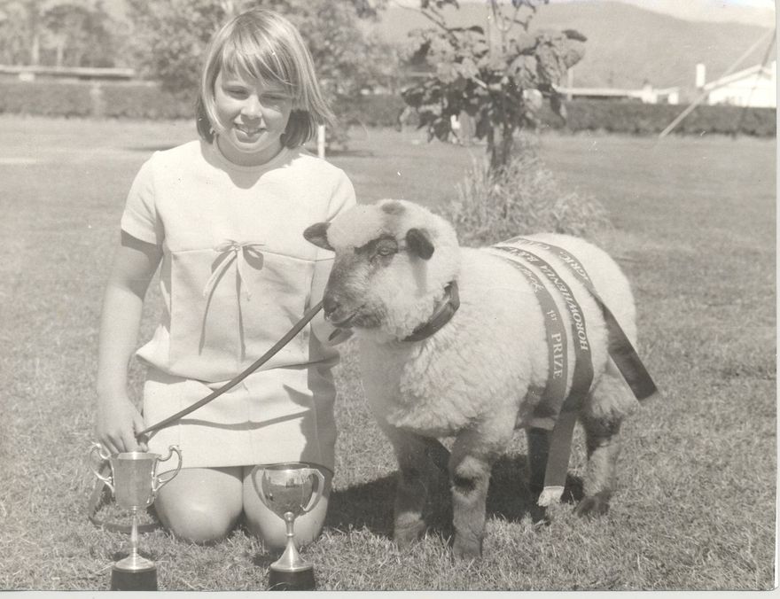 Girl (unidentified) with pet lamb and 2 prizewinners cups & 3 prize ribbons (including 1st pize). 1 B&W photo print