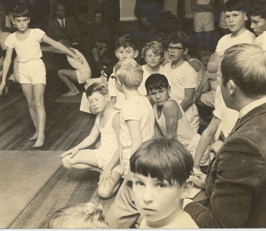 A group of competitors at the boy’s novice and intermediate grade gymnastics festival. 1 B&W photo print