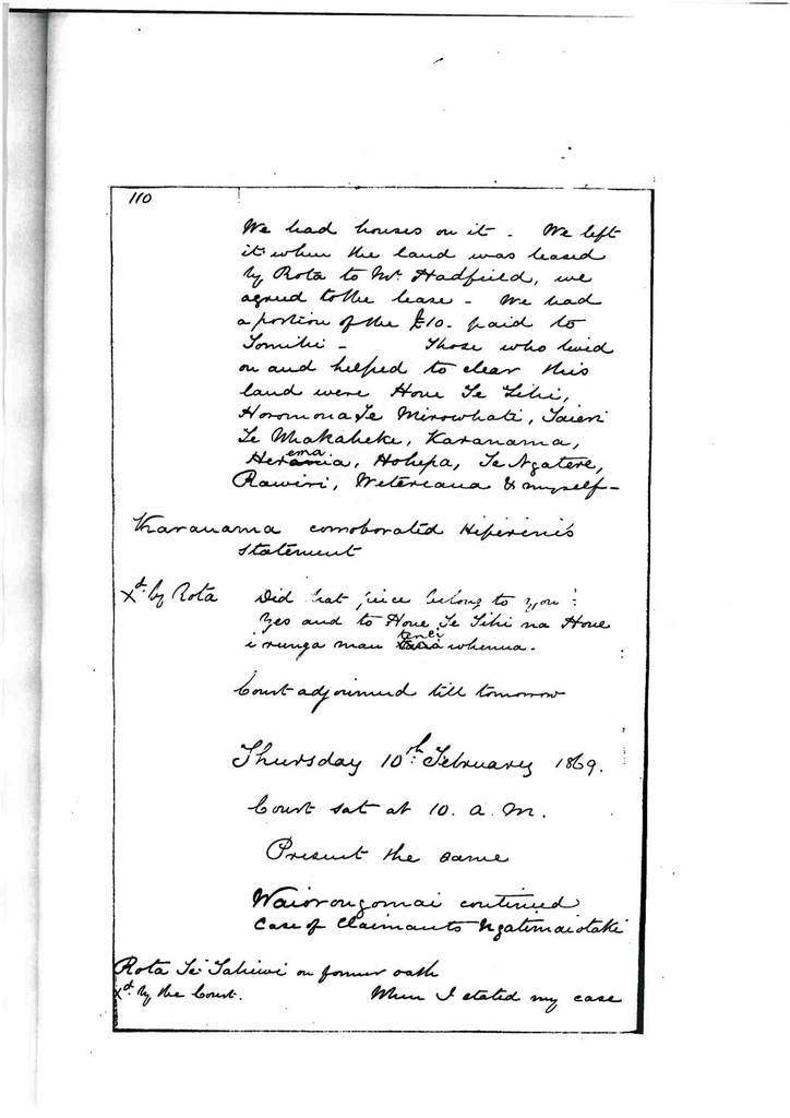 I remember Hone Te Tihi Hipirini and party going to work on the land they now claim in 1844. Te Wirihana took to wife the daughter of Hone and Hone was therefore allowed to work there. Hipirini and other friends followed. They only worked there one year and then went away, and never came back.