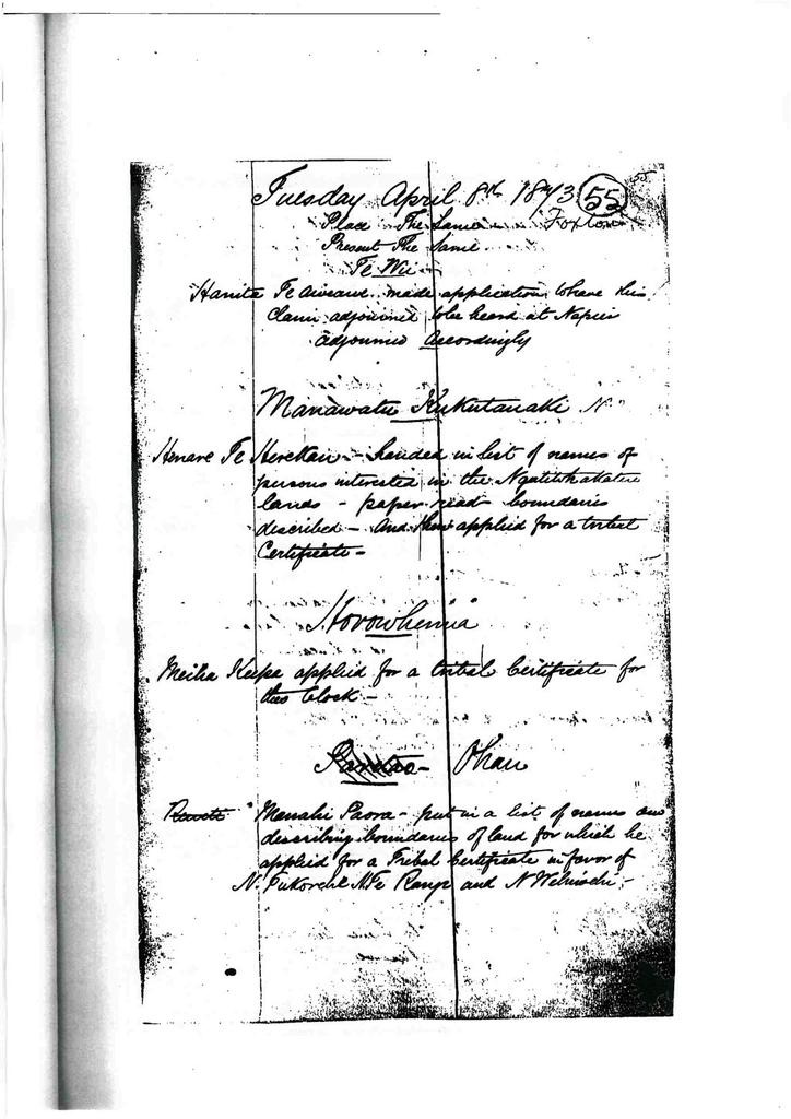 Eru Tahitangata put in a list of names and describing boundaries of lands for which he asked for a tribal certificate in favor of 4 tribes – Ngati Teau, Te Whiritaura, Ngati Kapu, and Te Mateawa.