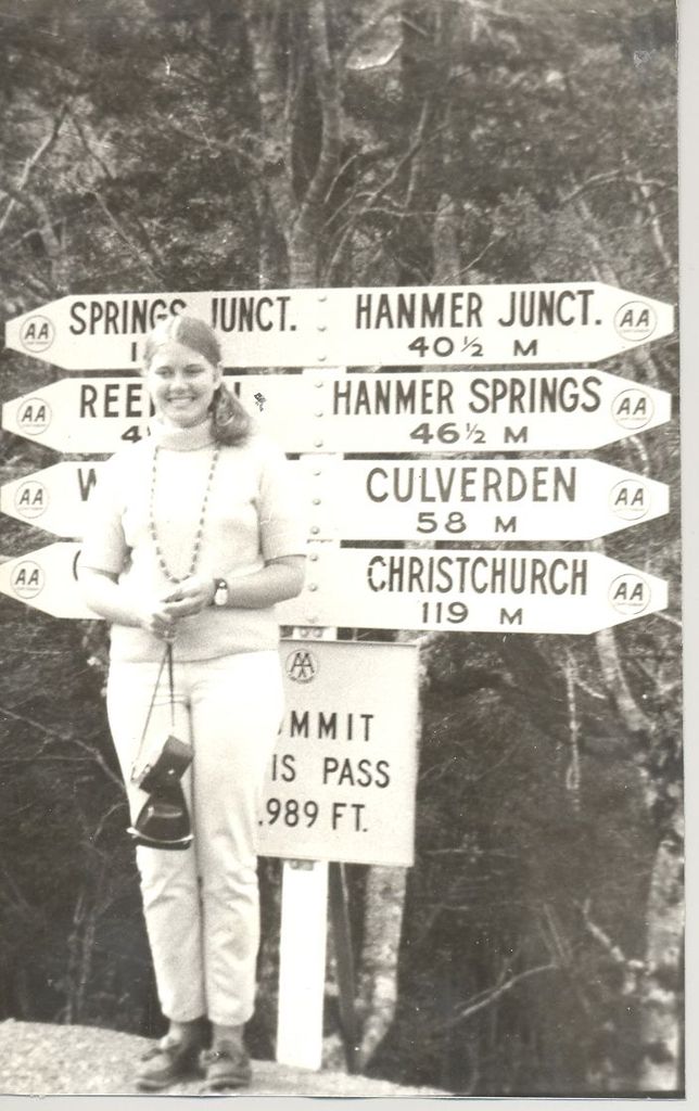 Woman (unidentified) standing in front of road signs at summit of Lindis Pass. 1 B&W photo print