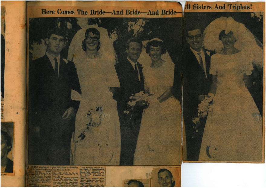 The Brethren Church was too small to accommodate the large assembly of guests and onlookers and the wedding was held in the larger Presbyterian Church. The three couples have chosen different parts of New Zealand for their honeymoons. The mother of the triplets, Mrs. Read, made the three brides' gowns and the three wedding cakes. As far as can be ascertained by checking with the Registrar General there has been no other triple wedding of triplets in New Zealand within living memory. (Photograph: C. H. Parks, Ltd., Lower Hutt).
