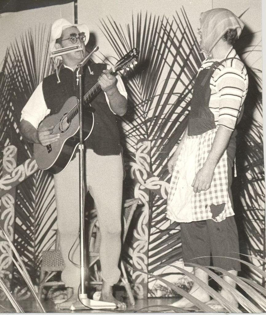 2 men (unidentified) performing on stage indoors. Man (left) playing guitar & mouth-organ in front of microphone. Man (right) wearing headscarf and torn apron.