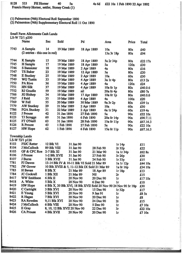 Levin Small Farm Allotments Perpetual Lease Ledger LS-W 71/2 p220 App Lease Name Sec Area Price/acre Total 1st-last payment 8128 533 FH Homer 40 5a 4s 6d £22 10s 1 Feb 1890 22 Apr 1892 Francis Henry Homer, settler, Stoney Creek (1)