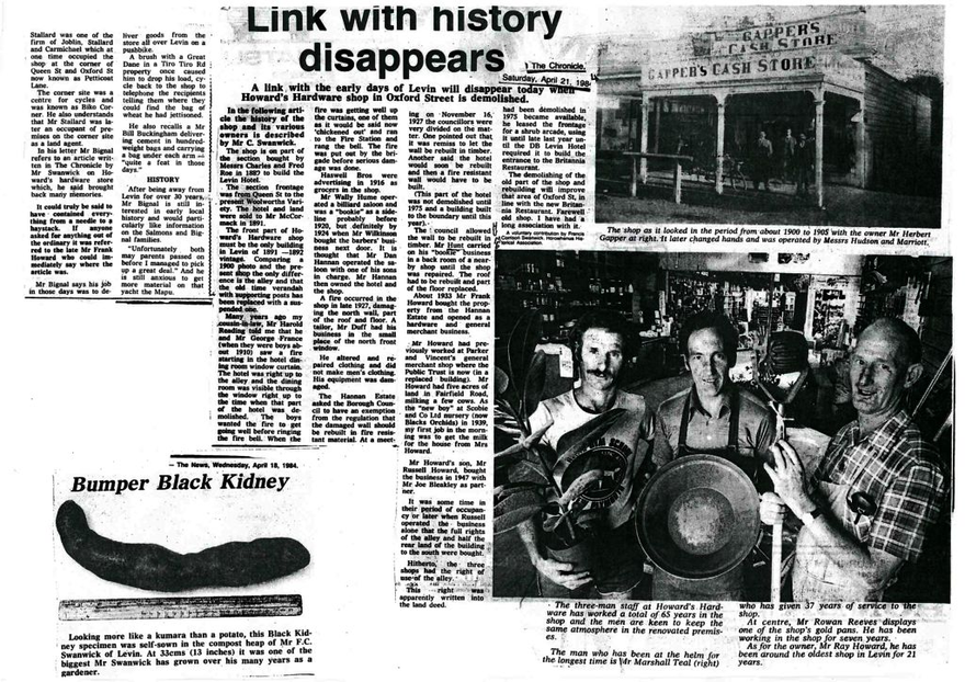 The shop is on part of the section bought by Messrs Charles and Fred Roe in 1889 to build the Levin Hotel.The section frontage was from Queen Street to the present Woolworths Variety. The hotel and land were sold to Mr McCormack in 1891.