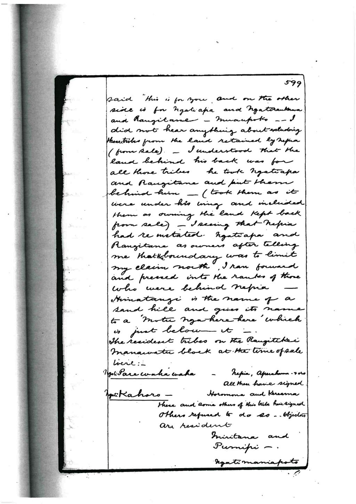 Muaupoko - I did not hear anything about excluding these tribes from the land retained by Nepia (from sale). I understood that the land behind his back was for all those tribes he took Ngati Apa and Rangitane and put them behind him - (took them as it were under his wing and included them as owning the land kept back from sale) I seeing that Nepia had reinstated Ngati Apa and Rangitane as owners after telling me that the boundary was to limit my claim worth. I ran forward and pressed into the ranks of those who were behind Nepia.