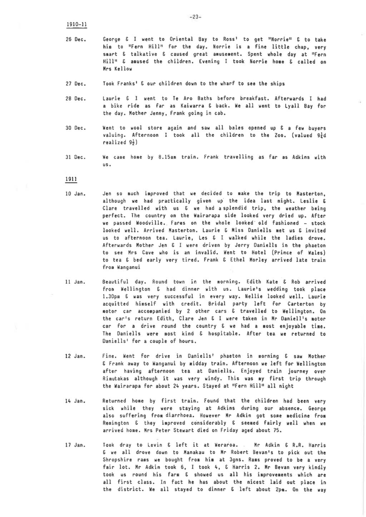 10 Jan. Jen so much improved that we decided to make the trip to Masterton, although we had practically given up the idea last night. Leslie & Clare travelled with us & we had a splendid trip, the weather being perfect. The country on the Wairarapa side looked very dried up. After we passed Woodville. Farms on the whole looked' old fashioned — stock looked well. Arrived Masterton. Laurie & Miss Daniells met us & invited us to afternoon tea. Laurie, Les & I walked while the ladies drove. Afterwards Mother Jen C I were driven by Jerry Daniells in the phaeton to see Mrs Cave who is an invalid. Went to Hotel (Prince of Wales) to tea & bed early very tired. Frank & Ethel Morley arrived late train from Wanganui 11 Jan. Beautiful day. Round town in the morning. Edith Kate & Rob arrived from Wellington & had dinner with us. Laurie's wedding took place 1.30pm & was very successful in every way. Nellie looked well. Laurie acquitted himself with credit. Bridal party left for Carterton by motor car accompanied by 2 other cars & travelled to Wellington. On the car's return Edith, Clare Jen & I were taken in Mr Daniell's motor car for a drive round the country & we had a most enjoyable time. The Daniells were most kind & hospitable. After tea we returned to Daniel's' for a couple of hours. 12 Jan. Fine. Went for drive in Daniel's' phaeton in morning & saw Mother & Frank away to Wanganui by midday train. Afternoon we left for Wellington after having afternoon tea at Daniells. Enjoyed train journey over Rimutakas although it was very windy. This was my first trip through the Wairarapa for about 24 years. Stayed at "Fern Hill" all night 14 Jan. Returned home by first train. Found that the children had been very sick while they were staying at Adkins during our absence. George also suffering from diarrhoea. However Mr Adkin got some medicine from Remington & they improved considerably & seemed fairly well when we arrived home. Mrs Peter Stewart died on Friday aged about 75. 17 Jan. Took dray to Levin & left it at Weraroa. Mr Adkin & R.R. Harris & we all drove down to Manakau to Mr Robert Bevan's to pick out the Shropshire rams we bought from him at 3gns. Rams proved to be a very fair lot. Mr Adkin took 6, I took 4, & Harris 2. Mr Bevan very kindly took us round his farm & showed us all his improvements which are all first class. In fact he has about the nicest laid out place in the district. We all stayed to dinner & left about 2pa. On the way home I got the dray & brought home new duchess that we recently purchased in Wellington. Mr A. kindly helped me unload at home. Discovered a large crack in side of duchess - evidently had bad knock on one of legs 28 Jan.