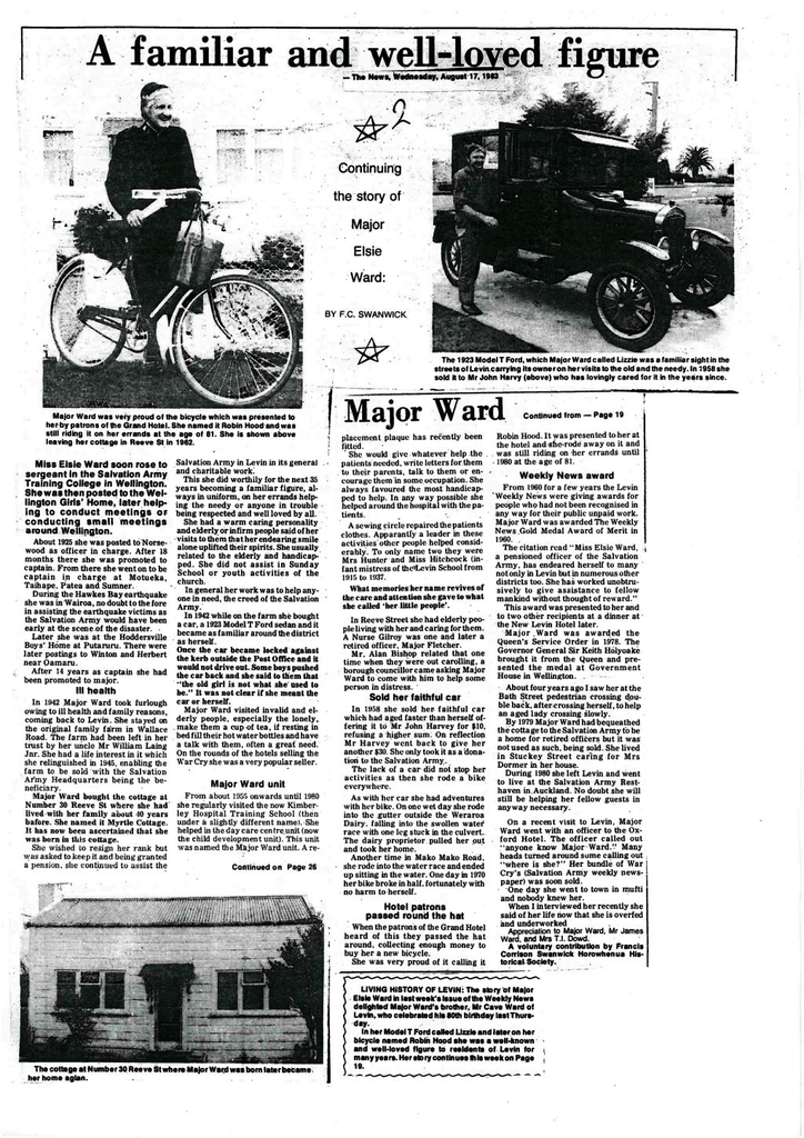The citation read “Miss Elsie Ward, a pensioned officer of the Salvation Army, has endeared herself to many not only in Levin but in numerous other districts too. She has worked unobtrusively to give assistance to fellow mankind without thought of reward.”