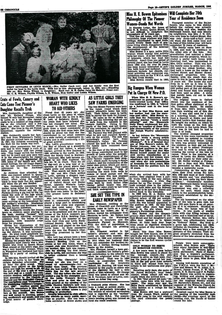 Mrs. Goldsmith, daughter of the late Mr. Richard Prouse, who turned 70 last November, came to Levin as a child. She cannot claim to be a resident of long standing as she returned only a few years ago when her mother died, aged 91 years. She lives in the old Prouse homestead, opposite the railway station.