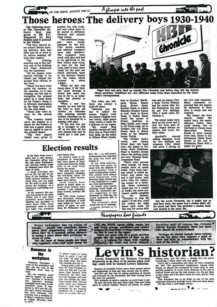 Corrie did a tremendous job when we were compiling the 1981 75th anniversary supplement. Among other things, he placed the occupants of every shop or commercial property in Levin from Weraroa to the end of Oxford Street and up the side streets too. He got them in date order and if he didn’t know for sure, said so. That wasn’t often.