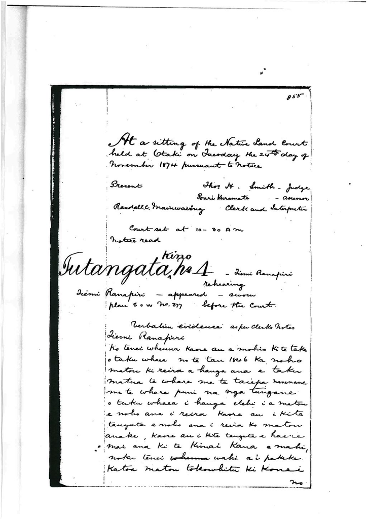 No Ngati Kauwhata. Ko te Awahuri taku kainga. Noku tenei whenua. Taku take ki tenei whenua na aku matua. Na aku matua hoki i tua nga rakau kaore ano au i tae kia kite i te taiepa. A e mohio ana au koia tenei te whenua e kootitia nei. Kotahi tonu te mahinga a Ngatiraukawa me aku matua i tenei whenua mahi ana a Ngati Raukawa i a ratou, mahi ana aku matua i tenei whenua, ko nga rohe a aku matua kei te mohio au, e mohio ana hoki nga tupuna o Tiemi ki nga rohe, noku tera whenua i muri iho i te nohoanga o Rngiuru ka noho ia e Ngaruinga tetahi taha o te whenua nei hei whaea keke ki a au. Mutu atu te mahi i reira takoto noa iho i muri iho. Koira anake te mahinga na taku whaea; I te tau 1863 ka tae mai matou ki te poupou i nga rohe o taua whenua, ahau a Marino, a Paranapa, a te Peina, he tupuna no Tiemi, a Moihi ana Ahitana he tuakana noku. Ko nga tangata enei na ratou i whakatakoto te rohe te taha kia ratou ko ana tupuna me te taha mai ki a maua ko toku tuakana . No te tau 1863 ka hokona e au kia Dr. Hewson tenei whenua ko tenei whenua i te mapi ne ii hokona katoatia e au kia Dr. Hewson. Ko tetahi taha kei waho ano. Ko aku kai korero ko Te Peinaand Renas. Ko nga korero ma te Teina ko ta raua Ngangaretanga ko Marino mo tetunga o te whare o tana tamahine ki runga ki taku whenua.