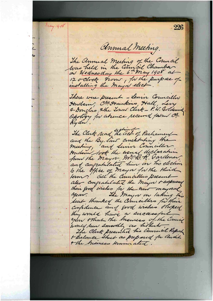 The Annual Meeting of the Council was held in the Council Chambers on Wednesday the 6th May 1908 at 12 o’clock noon, for the purpose of installing the Mayor elect.
